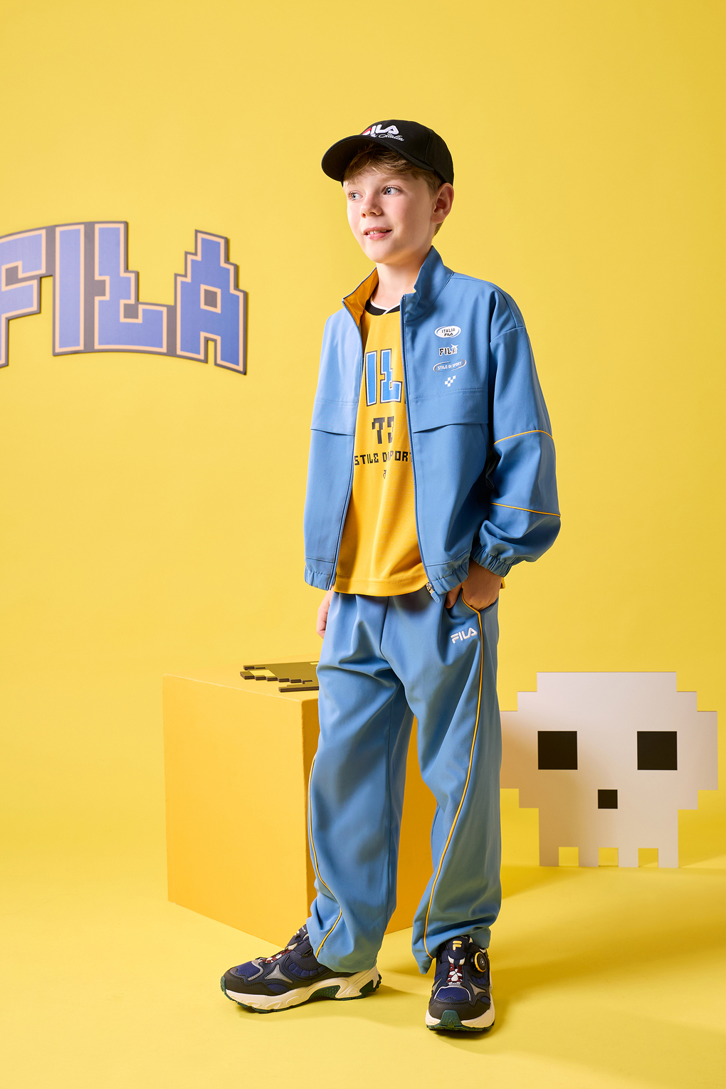 走進FILA PIXEL視覺宇宙,彷彿踏入 80 年代數位遊戲般的繽紛冒險,FILA KIDS TREND系列服飾以萬聖節配色結合像素字體設計為亮點,運用鮮豔撞色與活潑排字,將節慶氛圍轉化為充滿玩心的街頭風格。