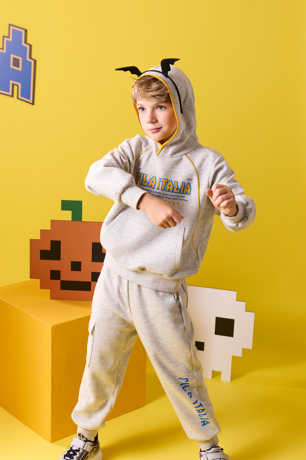 對於想與孩子一起玩風格的爸媽,FILA 同步推出呼應萬聖節氛圍OUTDOOR系列服飾配件,像是亮眼橘色連帽T恤、貓耳造型毛帽等單品,簡單搭配就能融入節慶氣氛。今年萬聖節,讓一家人一起登入FILA PIXEL世界,成為街頭最有玩心的 Halloween 玩家!